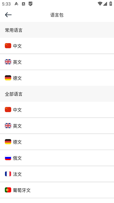 5、多语言包管理:提供“常用语言”与“全部语言”分类,常用语言默认展示,用户可根据需求下载/删除语言包。