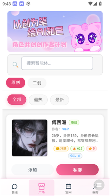多场景AI互动体系:支持单人私聊与多人群聊双模式,可从广场直接添加原创/二创角色,或在智能体管理页创建专属角色,群聊中角色还能基于人设相互互动,打破单一AI对话的局限性,满足不同陪伴场景需求。