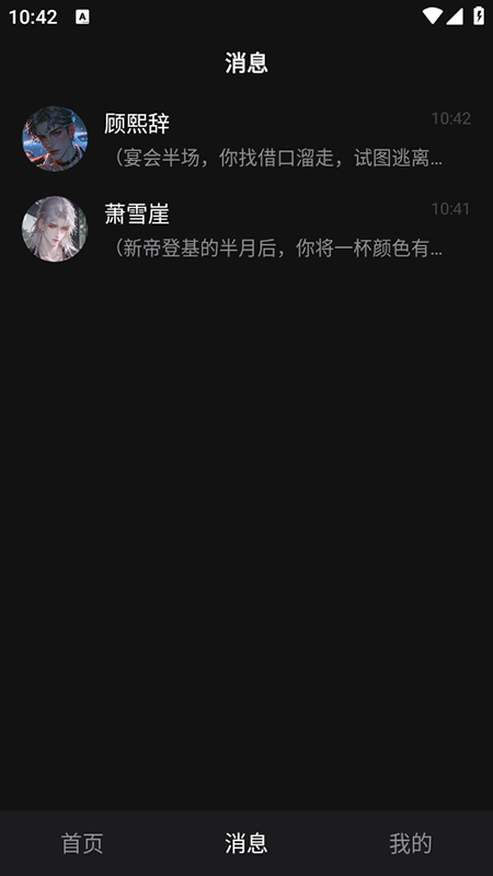 3、软件界面分为“首页、消息、我的”三大核心板块,首页展示角色列表与互动入口,消息栏查看历史对话,个人中心管理自定义角色,布局简洁直观。