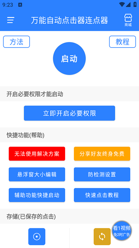 在本站内下载安装并打开万能自动点击器连点器App,点击【立即开启必要权限】,根据指示开启辅助功能和悬浮窗权限。