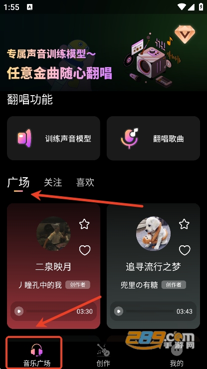 用户们也可以发布自己的作品到音乐广场上,或者欣赏他人的翻唱作品
