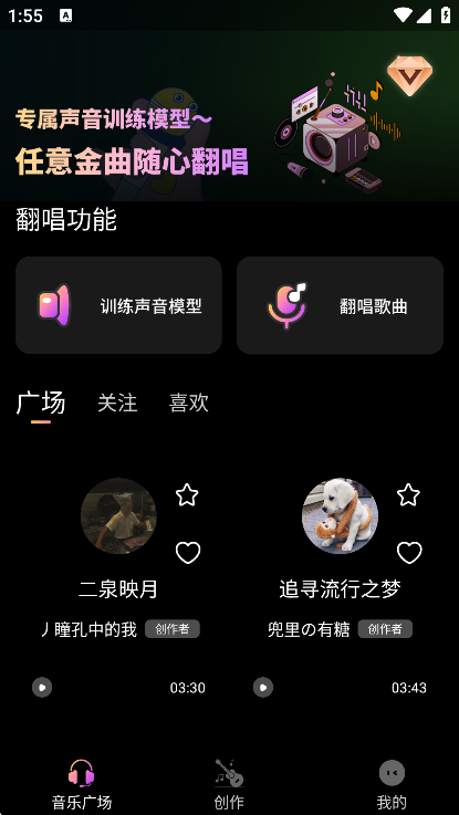 创作者作品社区内容:设有广场板块,汇聚各类风格的用户原创作品,涵盖原创Demo、声音克隆翻唱等内容,支持作品浏览、点赞互动,同时展示热门创作话题与案例,为用户提供灵感参考。
