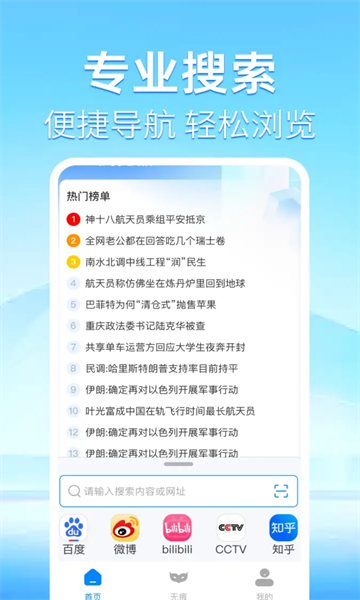 “搜索+资讯”一体化设计:区别于传统浏览器的单一搜索功能,将智能搜索与热点榜单深度结合,用户在搜索信息的同时可同步查看相关热点资讯,例如搜索“航天员”会关联展示最新航天新闻,提升信息获取效率。