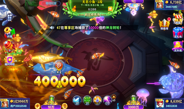 神话BOSS与功能鱼体系:主打魔神哪吒、烈焰领主等东西方神话BOSS,哪吒可升级为三头六臂形态,释放乾坤圈全屏攻击;功能鱼涵盖钻头鱼(触发全屏扫荡)、猜拳鱼(解锁奖励小游戏),金鲨作为高分核心鱼种,捕获成功率达50%且分值超200分。