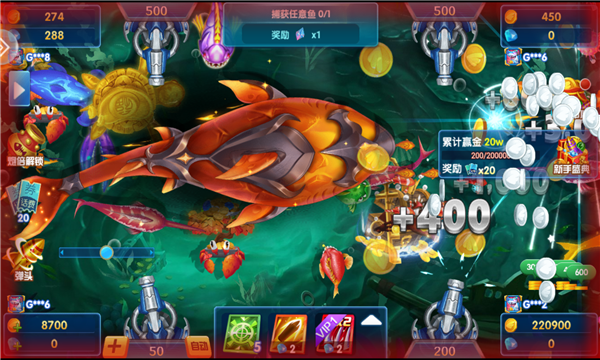 任务驱动与成就体系:日常任务涵盖“捕获100条小型鱼”“使用高倍炮命中5次大鱼”等目标,完成可获金币与道具奖励;成就系统设置“反弹炮弹捕获10条鱼”等特色目标,达成后解锁专属标识,增强游戏目标感。