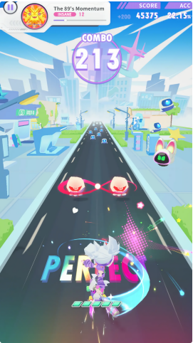 多维操作与节奏匹配机制:核心操作包含点击、滑动、长按、双指双击等指令,音符从屏幕远处向角色方向流动,需在音符到达判定区时完成对应操作——点击击打单个音符,滑动规避移动障碍,长按应对长条音符,双指双击击破特殊护盾。创新“节奏位移双轨系统”,操作精准度直接影响角色跑酷状态,连击数达标时角色自动加速,失误则触发减速惩罚。