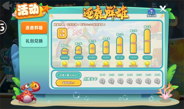 联盟协作与团队活动:联盟玩法是核心亮点,玩家可与联盟成员组队捕鱼,共享鱼群信息与道具资源,共同围捕高价值鱼类,大幅提升积分收益。定期举办联盟团队活动,如协作完成大型捕鱼任务,通关后可获得额外积分与稀有道具奖励。团队合作中,成员间可分工配合——部分人用锁定技能追踪鱼王,部分人用范围道具清场小鱼,形成高效捕捞闭环。
