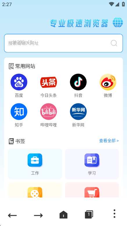 精简型导航与资源聚合:内置常用网站导航模块,涵盖新闻、电商、社交、视频、办公等高频使用场景,无需手动输入网址即可一键访问目标平台;同时整合百度、谷歌、必应等主流搜索引擎,支持快速切换,满足用户多样化信息检索需求,减少操作步骤。