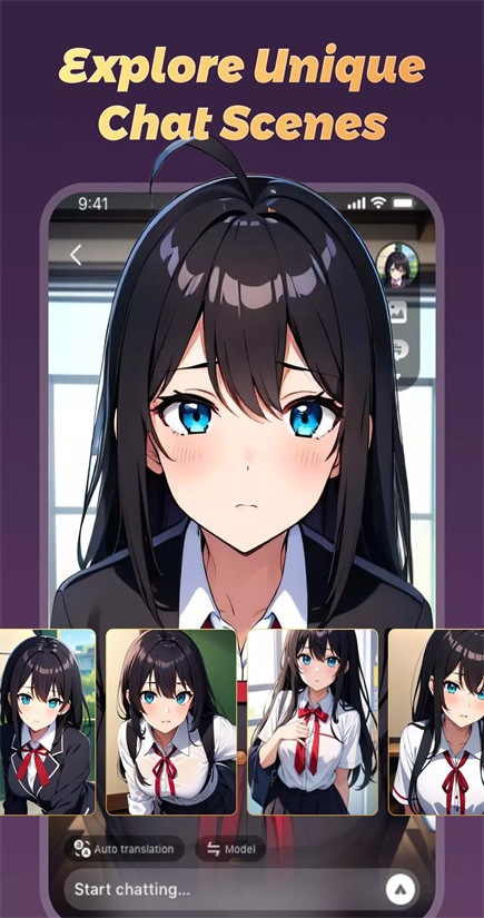 创意创作与社区分享内容:设有AI绘画作品展示区、角色互动故事分享板块,用户可上传自定义角色形象、聊天精彩片段与创作的动漫风格内容,形成“创作-互动-分享”的内容闭环,同时平台定期更新新角色与剧情素材,保持内容新鲜感。