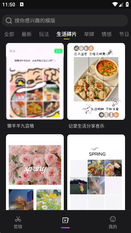 全链路创作素材与模板库:素材层面支持多渠道获取——通过“视频解析”功能复制链接即可保存高清素材,“热榜聚合”实时拉取多平台热门话题,帮助创作者紧跟潮流;模板库覆盖多元场景,包含生活碎片、举牌、情感、种草带货等分类,既有“懒羊羊九宫格”“孤独的鲸鱼”等趣味模板,也有电商海报、感恩卡等实用模板,替换内容即可快速生成同款,节省创作时间。