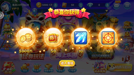 智能操作辅助功能,新手老手都适配:新增智能瞄准与自动射击辅助模式,新手玩家可开启智能瞄准,系统自动锁定高价值鱼类,降低操作难度;资深玩家可自定义射击参数(如射速、瞄准灵敏度),搭配手动瞄准精准捕猎。同时支持手势快捷操作,通过滑动屏幕快速切换炮台角度,提升捕鱼操作的便捷性与精准度。