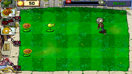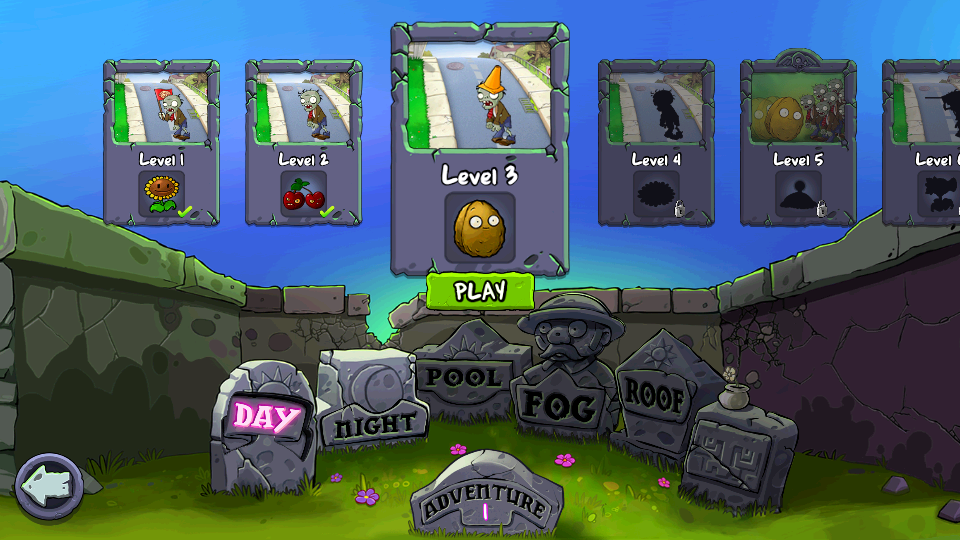 冒险模式(主线):50个关卡,从白天庭院→夜晚庭院→泳池→屋顶逐步解锁,每个场景有专属僵尸和植物;