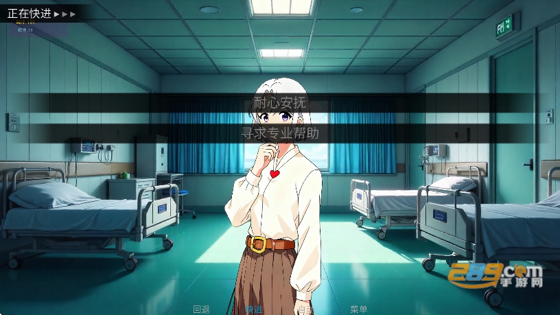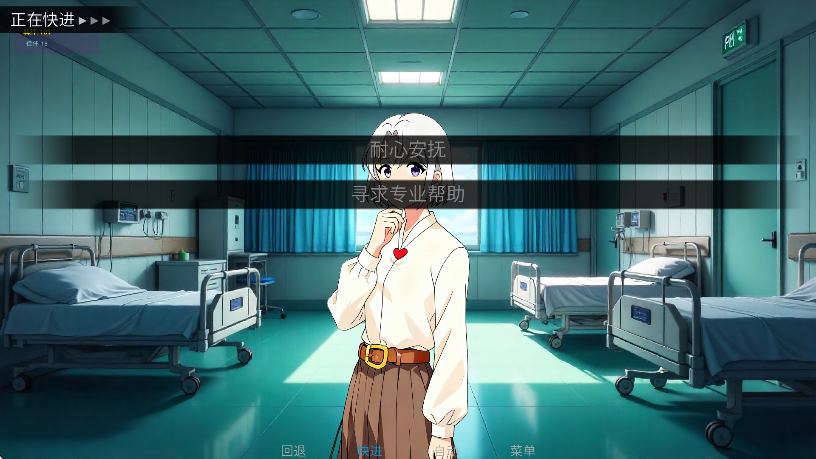 轻交互剧情推进玩法:整体为点击式操作,无复杂战斗或解谜,玩家通过点击“快进”“自动播放”控制剧情节奏,遇到情感波动场景时,会触发“冷静面对”“情绪共鸣”等互动选项,选择不同选项会影响主角的心理状态描述,让剧情体验更具代入感;游戏界面简洁,仅保留“回退”“菜单”等必要功能,聚焦剧情本身。